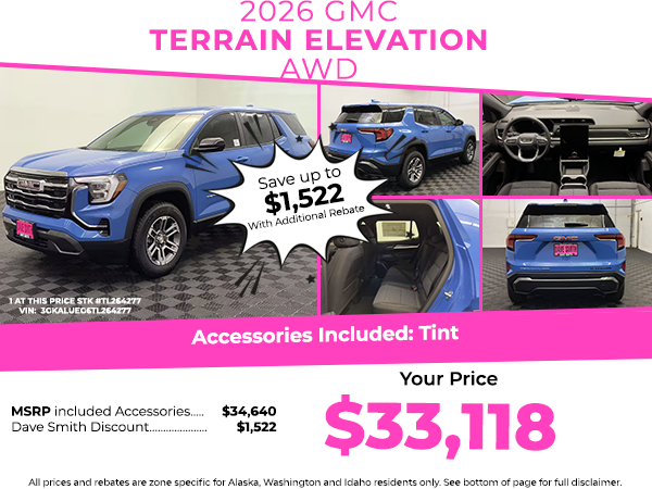 EquipmentIt keeps you comfortable with Auto Climate. Protect this mid-size suv from unwanted accidents with a cutting edge backup camera system. Never get into a cold vehicle again with the remote start feature on this model. The state of the art park assist system will guide you easily into any spot. Keep your hands warm all winter with a heated steering wheel in the vehicle . This GMC Terrain stays safely in its lane with Lane Keep Assist. This model features a hands-free Bluetooth phone system. You'll never again be lost in a crowded city or a country region with the navigation system on this mid-size suv. This 2026 GMC Terrain 's Lane Departure Warning helps keep you in your lane. This mid-size suv has auto-adjust speed for safe following. This mid-size suv is outfitted with an OnStar communication system. This mid-size suv has a 4 Cyl, 1.5L high output engine.